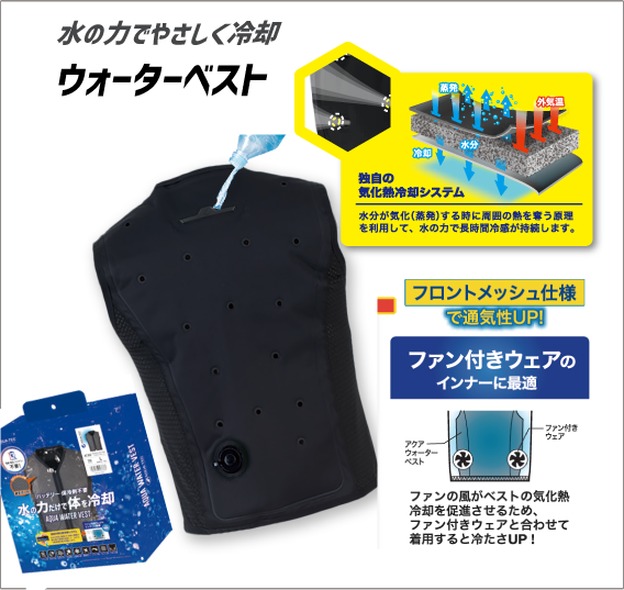 水の気化熱でやさしく冷却。バッテリー不要で軽快!ファン付きウェアのインナーにも最適で、工場・厨房・清掃業務など幅広く活躍。