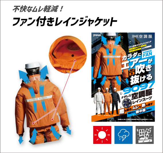 レインウェアにファンを搭載した新発想!雨を防ぎながら空気を循環させ、ムレを軽減。豪雨時の熱中症対策にも活躍する一着。