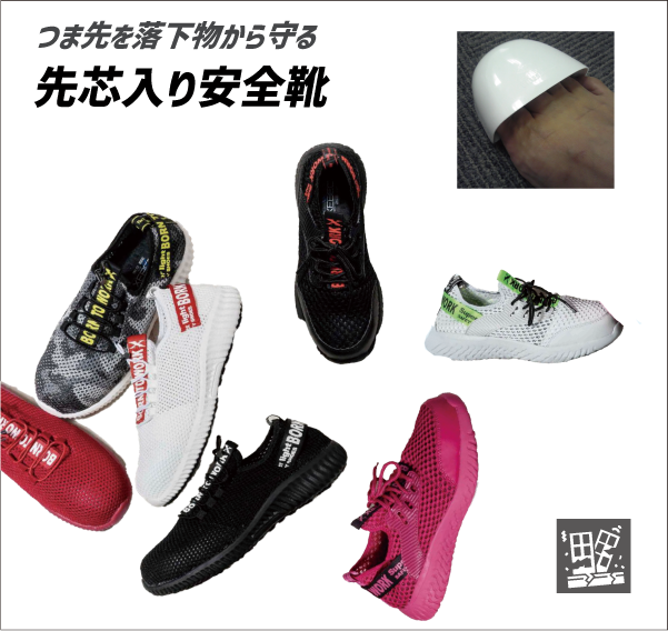 重いイメージの安全靴も今は軽量で快適。黒革からスニーカータイプまでデザインも豊富で、いざという時に備えて気軽に置いておける先芯入り安全靴。