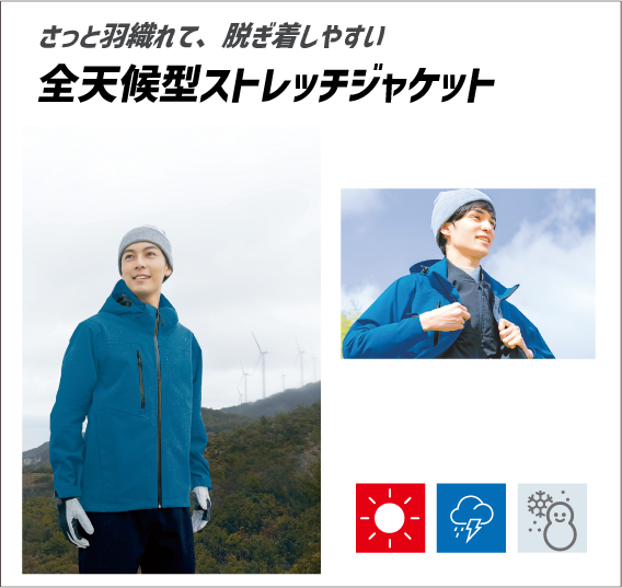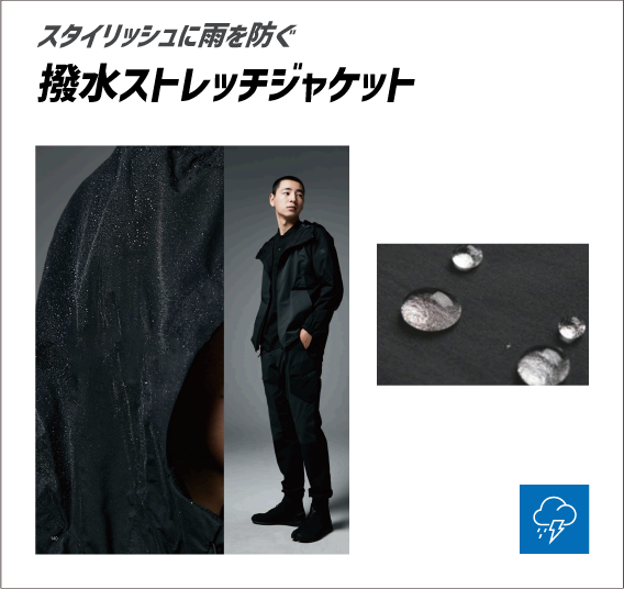 スタイリッシュに着こなせる撥水ストレッチジャケット。雨をしのぎつつ動きやすく、営業や納品シーンでも違和感なく着用可能。制服にも最適な一着。