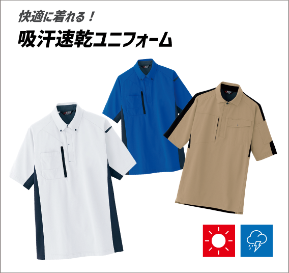 急な雨に襲われても、綿より乾きが早いから不快感を軽減。サッと乾いて快適に着れる吸汗速乾ユニフォームは、雨の日も安心して働ける一着。