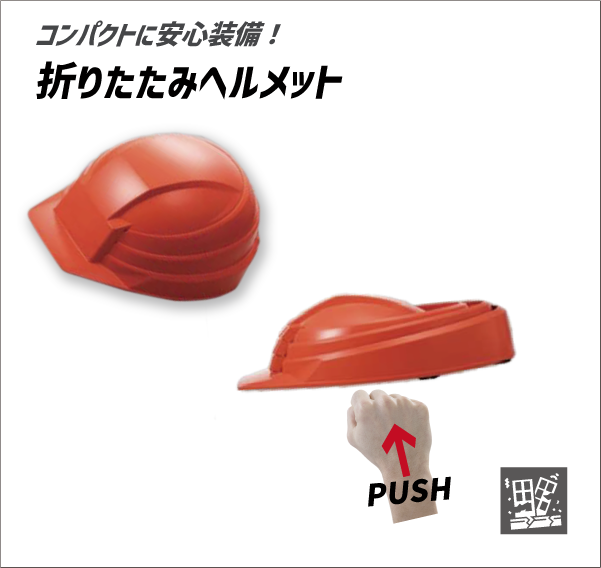 押すだけで即座に組立完了!薄くたためて備蓄も携帯もラク。大人からこどもまで使え、豊富なカラーで識別にも最適な折りたたみヘルメット。