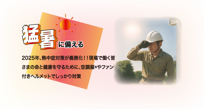 2025年、熱中症対策が義務化!!現場で働く皆さまの命と健康を守るために、空調服やファン付きヘルメットでしっかり対策。