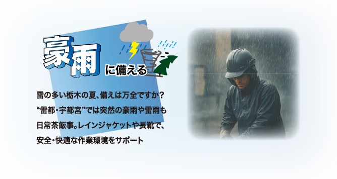 雷の多い栃木の夏、備えは万全ですか?“雷都・宇都宮”では突然の豪雨や雷雨も日常茶飯事。レインジャケットや長靴で、安全・快適な作業環境をサポート。