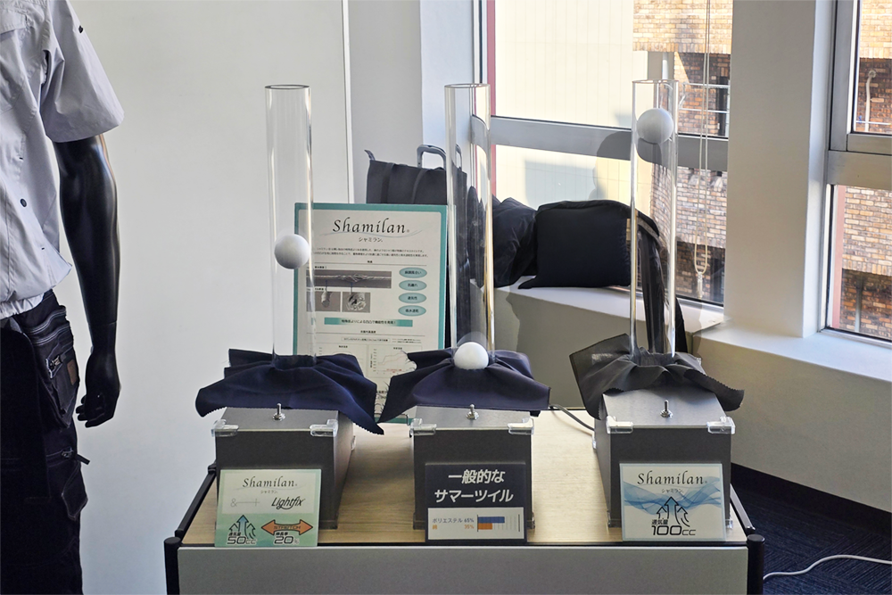 専用の風量装置を使い、生地にどれくらい風が通るのかを体験できる仕組みで、実際に手をかざすと空気が通る感覚を確認することができます。